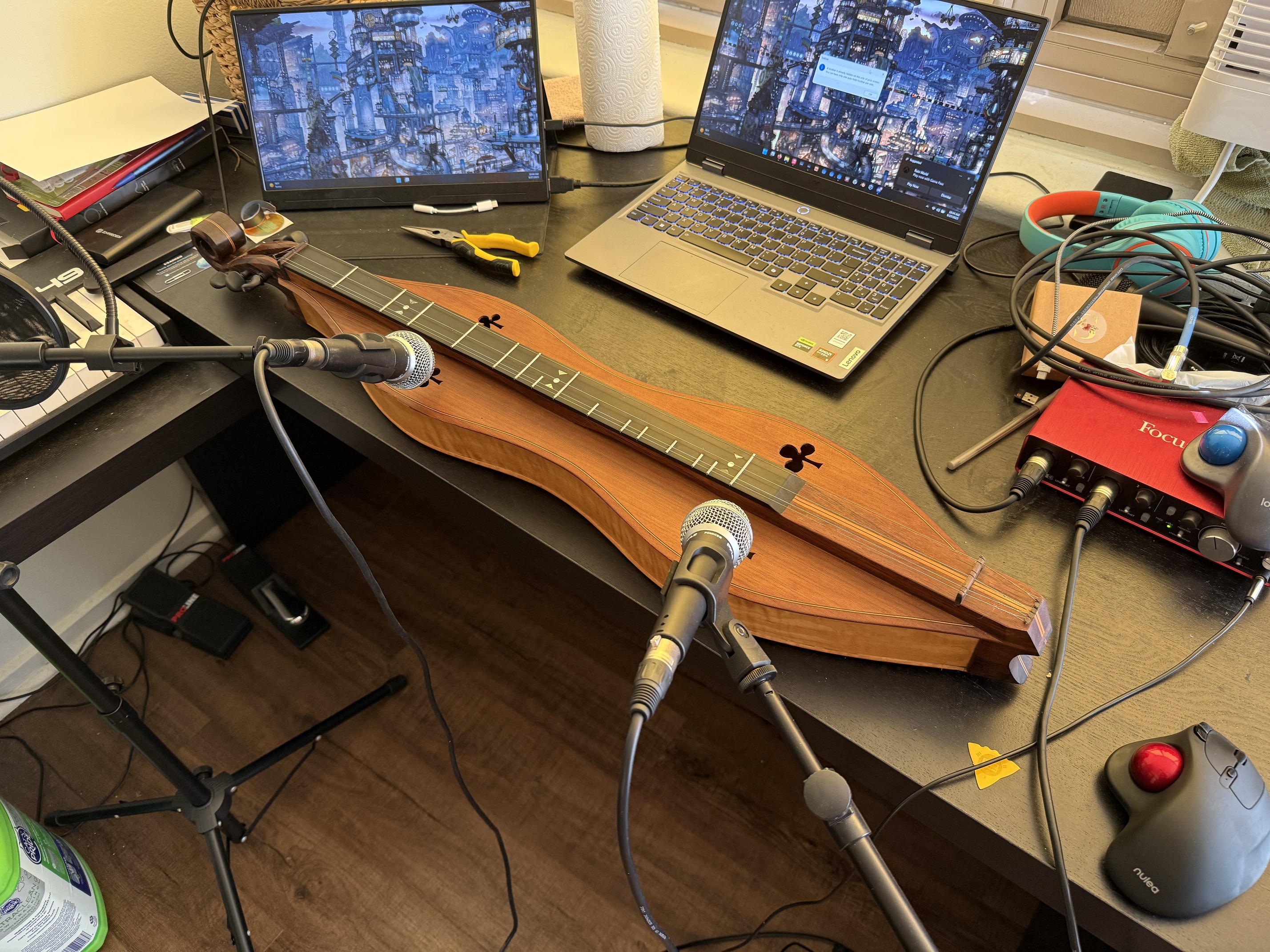 There were four recording sessions throughout the jam: sampling a mountain dulcimer, recording the voice acting, and two sessions of recording sound effects.