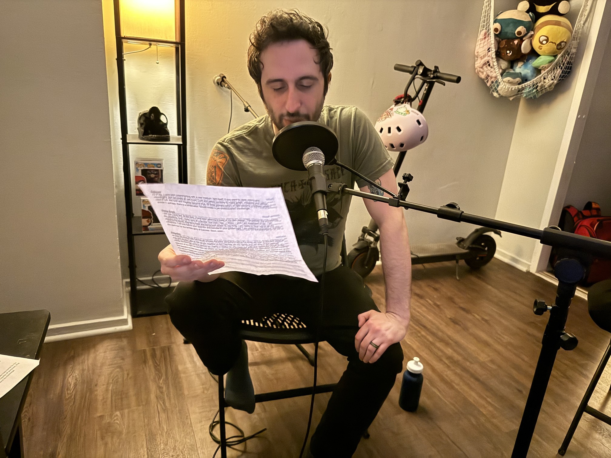 Up next was the voice acting session. About halfway through the jam, I recorded Seren’s husband, Jordan, performing the lines Seren had written for Uncle Henry. We recorded 10 “regular” lines and then one line for the distorted section at the end. For the distorted section we recorded multiple takes of both Seren and Jordan saying the line in vague unison, including takes from Jordan with an Irish accent and a take spoken in french.