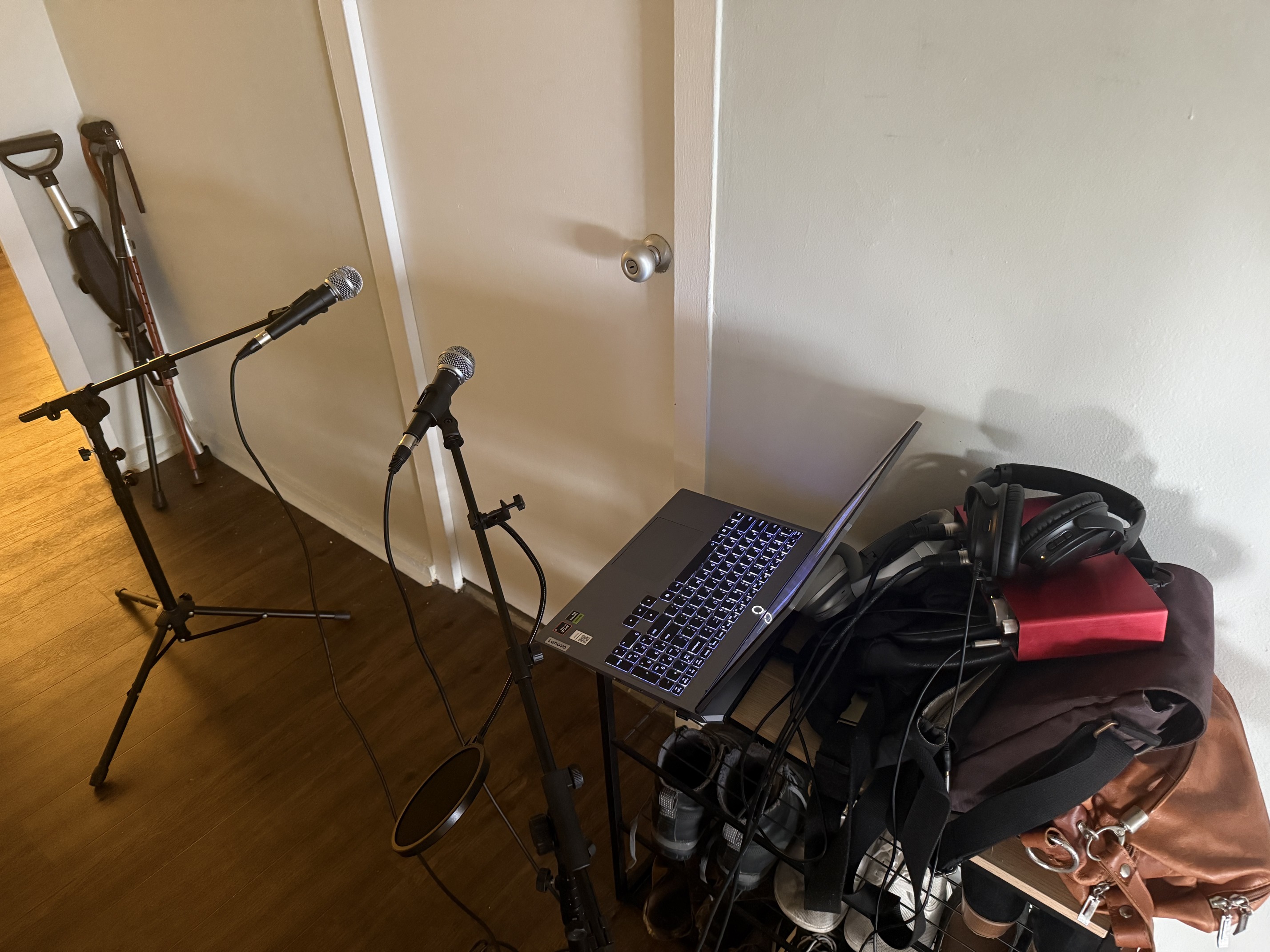 The first sound effects recording session was me recording random things around my apartment. Since I don’t have a field recorder, I set up two microphones on mic stands and moved them around the apartment, my laptop and audio interface (and associated cables) trailing behind. From these sessions, what got in the game was a light switch sound (the lock puzzle clicks and new log entry click) and the door sounds.