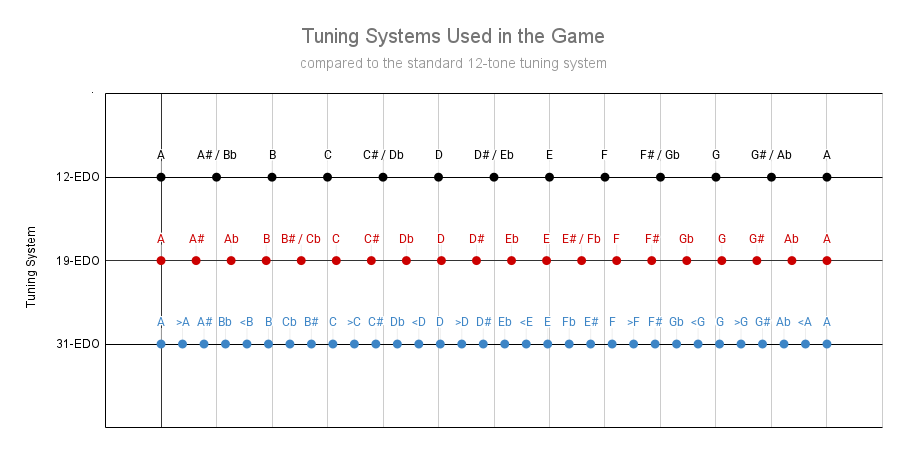 I ended up using both a 19 tone tuning system (19-EDO) and a 31 tone tuning system (31-EDO). For the regular walking around music, I used 19-EDO, and for the title screen and credits music I used 31-EDO.
